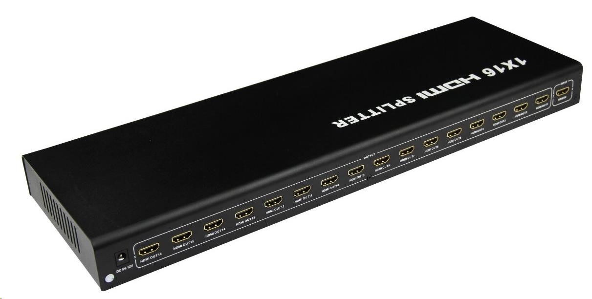 HDMI Video Splitter 1 => 16 s externým napájaním, HDMI 1.kompatibilné s 4a max. rozlíšenie 1080i a 1080p. K jednému zdroju signálu HDMI môžete pripojiť viacero obrazoviek HDMI. - kompatibilný s DTV 480i, 480p, 720i, 720p, 1080i a 1080p - podpora VGA, SVGA, XGA a UXGA - HDMI 1.4a - Podporuje Full 3D - HDCP ready - LED indikácia stavu - Napájací adaptér 230 V súčasťou balenia - Prenáša obraz aj zvuk - Podporuje až 15 m kábla HDMI na vstupe a 25 m kábla HDMI na výstupe. (zosilňuje signál HDMI) - kovový kryt pre lepší odvod tepla Ak sa obraz nezobrazí ihneď po zapojení rozbočovača, počkajte približne 30 s, kým sa signál rozpozná...