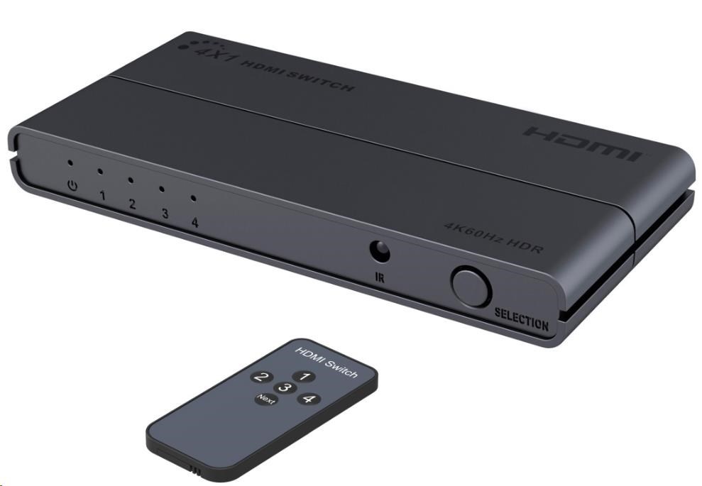 Prepínač HDMI PremiumCord 4:1 s rozlíšením 4Kx2K@60Hz, 1080P, HDR, tlačidlovým ovládaním a diaľkovým ovládaním