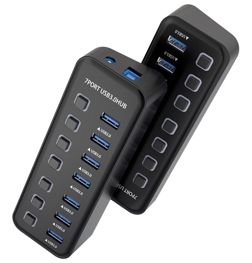 Hub umožní pripojiť do jedného portu USB až 7 ďalších zariadení USB. Zariadenie je USB3.2 s rýchlosťou až 5Gbps. Pomocou vypínačov je možné jednotlivé USB periferie pripájať a odpojiť.