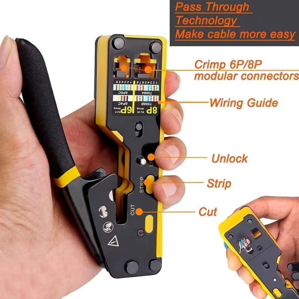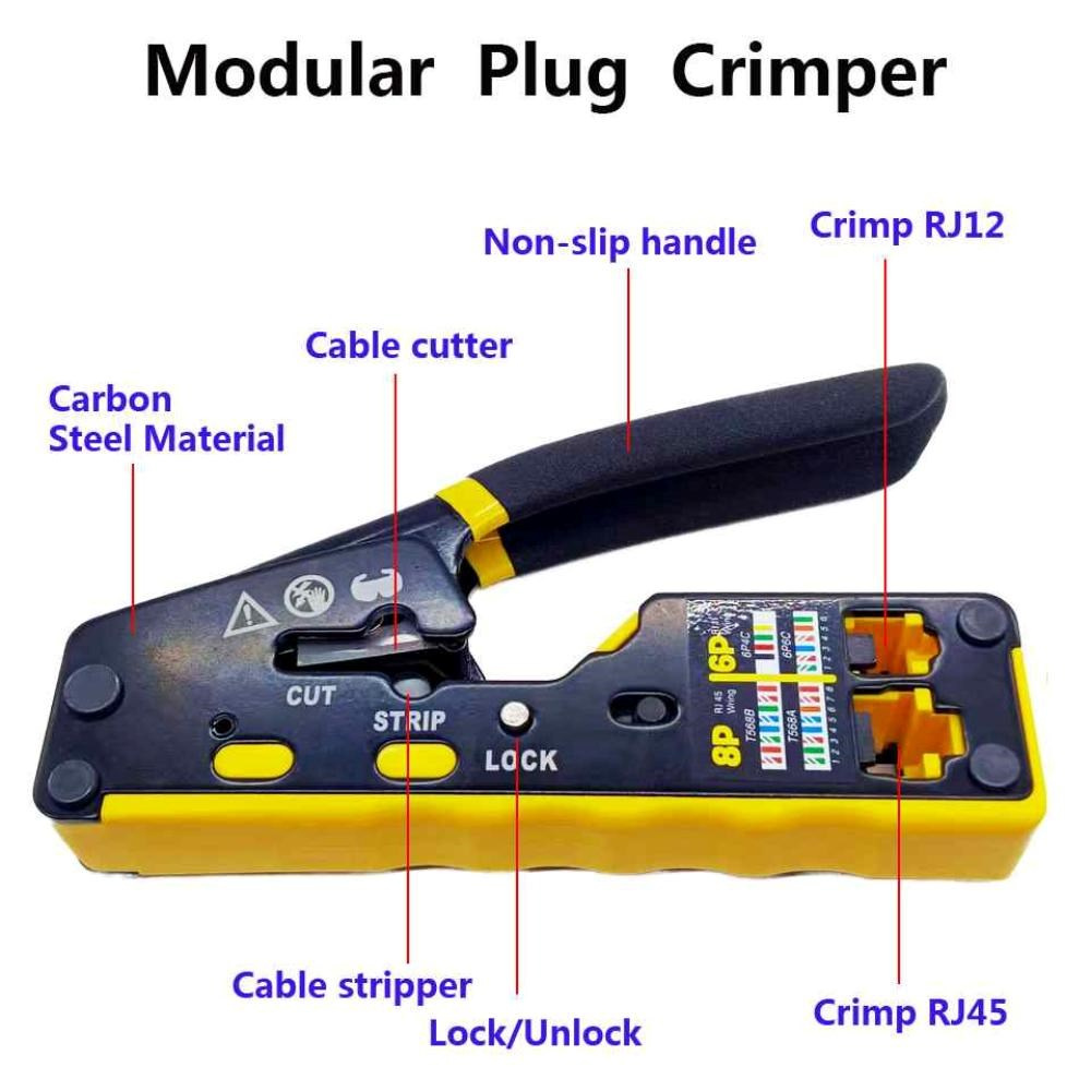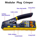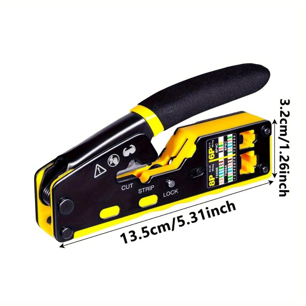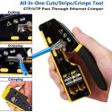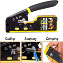 PremiumCord krimpovacie kliešte na priechodné RJ konektory sú spoľahlivým univerzálnym nástrojom na prácu s väčšinou bežných modulárnych zástrčiek radu RJ — vrátane RJ11, RJ12, RJ14, RJ45 a ďalších typov. Vďaka konštrukcii 3 v 1 umožňujú jednoduché krimpovanie, strihanie aj odizolovanie káblov, čo výrazne urýchľuje a upresňuje prácu pri výrobe či opravách sieťových a telefónnych vedení.
