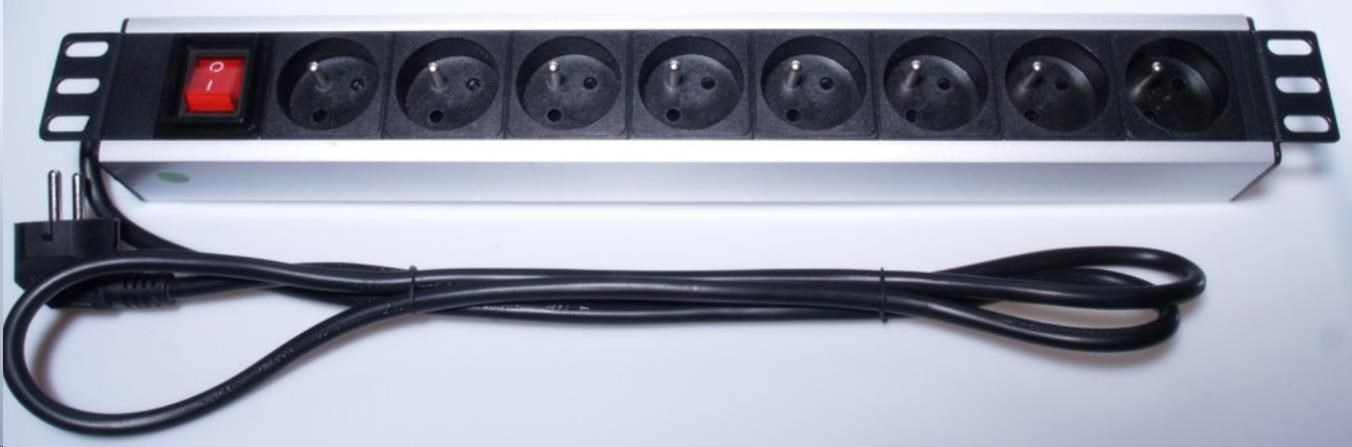 Napájací panel do 19" racku, 8x230V, 2m kábel, vypínač - vyhotovenie z eloxovaného hliníka - horizontálne na montáž do 19" Racku - výška 1,5U - 8x 230V zásuvka - maximálny prúd: 16A - UTE zásuvky - 1.5mm2 priečny rez kábla - dĺžka kábla 2m - vypínač presvietený s plastovou krytkou proti náhodnému vypnutiu - rozmery: šírka s pevnými úchytmi: 485mm, výška: 61mm, hĺbka: 44mm - pracovná teplota: 0-40°C - napájací panel obsahuje sáčik s kompletnou sadou skrutiek na montáž do 19' racku