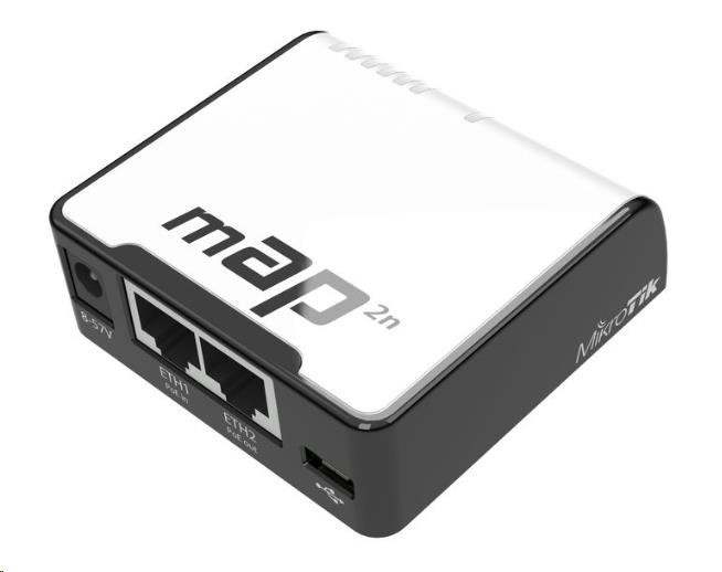 RBmAP2nD je veľmi malý prístupový bod (AP) so všetkými možnosťami systému RouterOS. Veľkou výhodou tohto AP je, že slúži aj ako PoE pre CPE (napr. SXT, eth02 do 500 mA, výstupné napätie zodpovedá vstupnému napätiu). Podporované je aj PoE (pasívne 10-57 V alebo aktívne 802.3af/at) je k dispozícii aj konektor napájania. Integrovaná WiFi teraz podporuje duálne reťazenie a pracuje v pásme 2.4GHz a podporuje 802.11b/g/n. K dispozícii je aj konektor microUSB na pripojenie modemu 3G/4G (konektor microUSB môže slúžiť aj ako zdroj vstupného napätia).