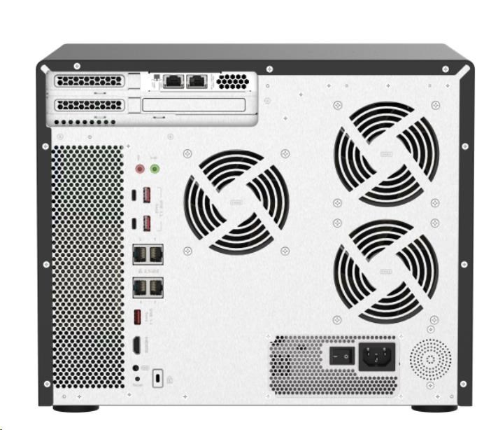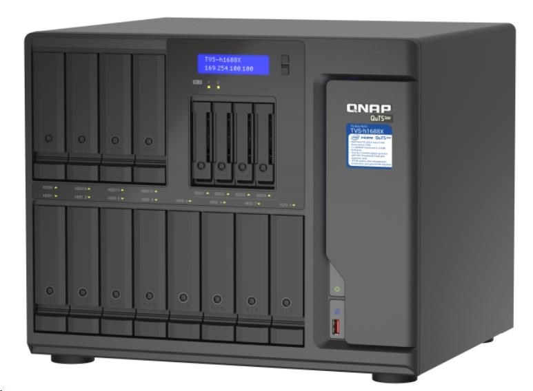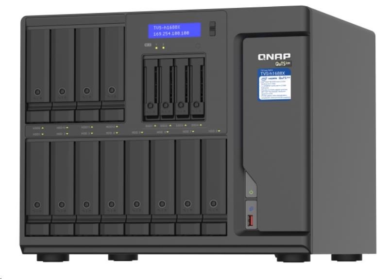 Vysokokapacitné zariadenie TVS-h1688X je vybavené výkonným procesorom Intel® Xeon® W a umožňuje inštaláciu dvoch QNAP rozširujúcich kariet QXP-T32P Thunderbolt™ 3 PCIe (predávajú sa samostatne) na získanie štyroch portov Thunderbolt™ 3, čo z neho robí dokonalý doplnok pre používateľov Mac® a Windows® s Thunderbolt™ pre vysokorýchlostnú spoluprácu pri spracovaní médií. Integrované pripojenie 10GbE a 2,5GbE podporuje slučkovanie portov a failover, aby ešte viac vyhovovali podnikových aplikáciám náročným na šírku pásma a spoľahlivosť. Zariadenie TVS-h1688X využíva operačný systém QuTS hero na báze ZFS a podporuje blokovú inline deduplikáciu a kompresiu dát, takmer neobmedzený počet snímok, SnapSync v reálnom čase a technológiu ZFS cache pre čítanie/zápis, čo pomáha vašemu podniku dosiahnuť výkon spoľahlivosti na úrovni dohody o poskytovaní služieb, od kreatívnych pracovných tokov po súborový server, virtualizačný server a efektívne aplikácie na zálohovanie a obnovenie súborov.