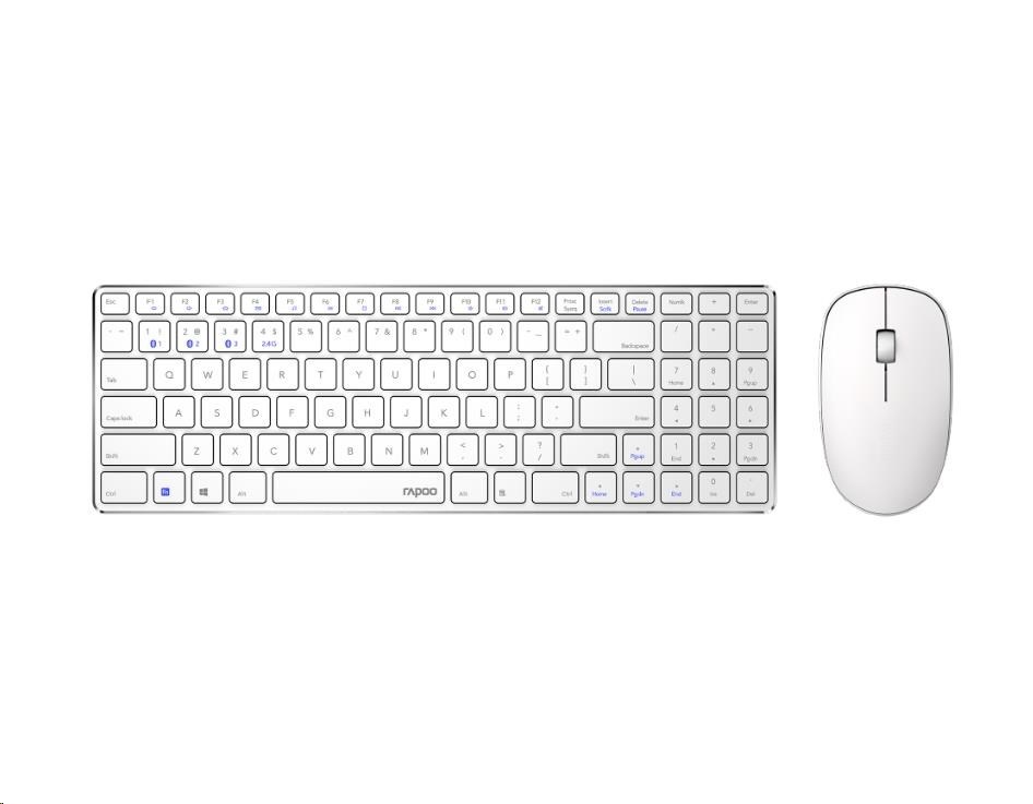 Popis Súprava klávesnice a myši RAPOO 9300M, bezdrôtová, viacrežimová tenká myš, ultratenká klávesnica, biela