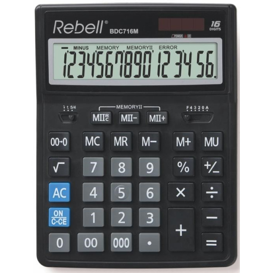 16místná stolní kalkulačka s úhlovým displejem a 2 paměťmi.