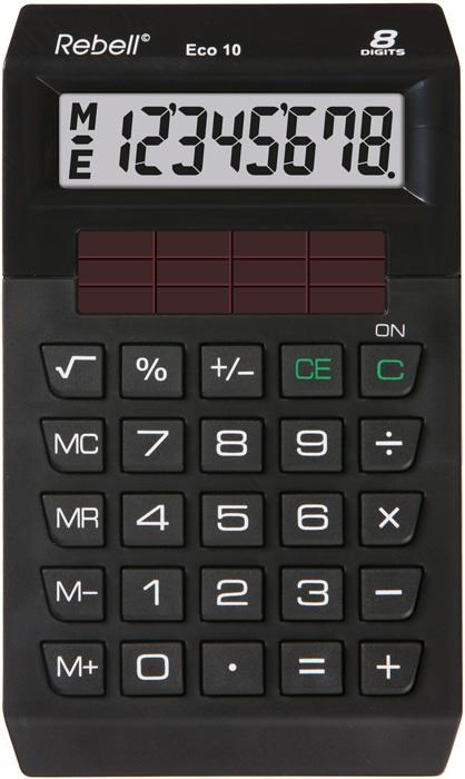 Základná 8-miestna vrecková ekologická kalkulačka s 100 % solárnym napájaním, základnými matematickými funkciami, pamäťou na 4 klávesy a certifikáciou Blue Angel. Vyrobené zo 70 % z recyklovaných materiálov.