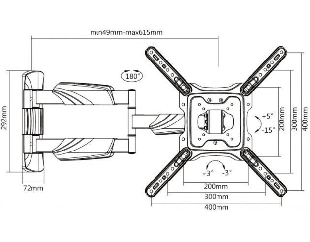 Nástenný oceľový držiak pre LCD monitory a televízory s uhlopriečkou 23"- 55" (58-140 cm) a maximálnou hmotnosťou 35 kg. 3x záves, vertikálne výklopný +5°/-15° a horizontálne otočný +90°/-90°, vzdialenosť od steny 49-615 mm, materiál oceľ, farba čierna. Montáž VESA: 75x75, 100x100, 100x200, 200x200, 300x200, 300x300, 400x200, 400x300, 400x400...