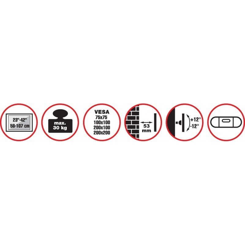 Nástenný oceľový držiak s minimálnou vzdialenosťou od steny na veľké LCD TV s uhlopriečkou 37"- 70" (94-178cm) a hmotnosti maximálne 35kg. Konzola na zavešenie TV s upevnenými držiakmi, vertikálne výklopný +0°/-12°, vzdialenosť od steny 30mm, rozmery 702 x 450 x 30 mm, farba čierna. Uchytenie VESA: 200x200, 300x200, 300x300, 400x200, 400x300, 400x400, 600x400. Fine Tuning pre jednoduché presné nastavenie po upevnení na stenu.