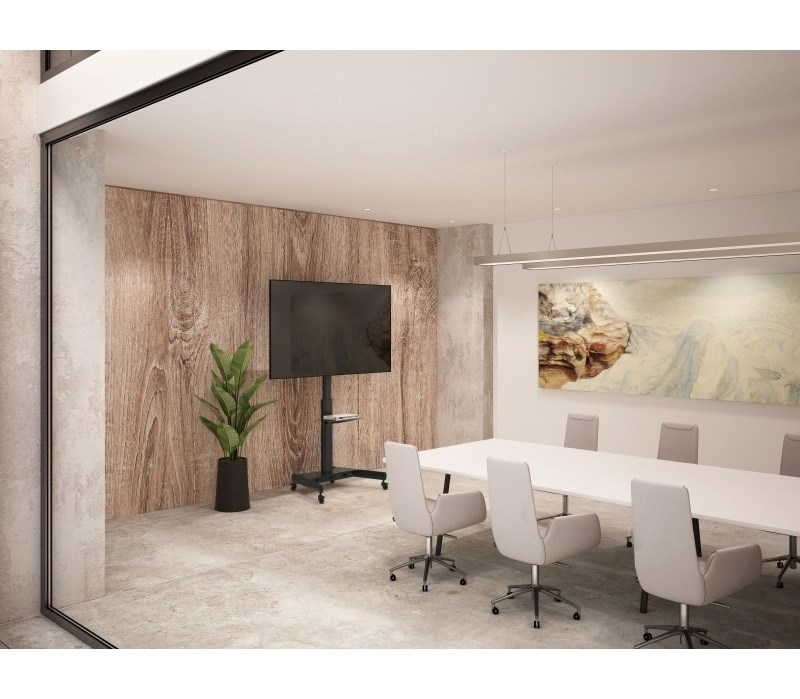 Televízny stolík na veľké TV s uhlopriečkou 32"- 65" (81-165cm) a hmotnosťou maximálne 35kg. Stredový nosný profil 120-160cm na kolieskach s aretáciou, držák vertikálne výklopný +0°/-10°, police 33x43cm max 5kg, Cable managment, rozmery 87x63x142cm, materiál hliník/ocel, farba čierna. Uchytenie VESA: 200x200, 300x200, 300x300, 400x200, 400x400, 600x400.