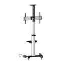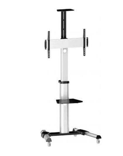 Moderný televízny stolík na Plasma a LCD TV s uhlopriečkou 37"- 70" (94-178cm) a hmotnosťou maximálne 50kg. Stredová teleskopická nosná tyč na kolieskach, držiak otočný o 90° a vertikálne výklopný +5°/-12°, horná výškovo nastaviteľná plocha pre kameru, polička, AluDesign, farba strieborná. Uchytenie VESA: 200x200, 300x300, 400x200, 400x400, 600x400.