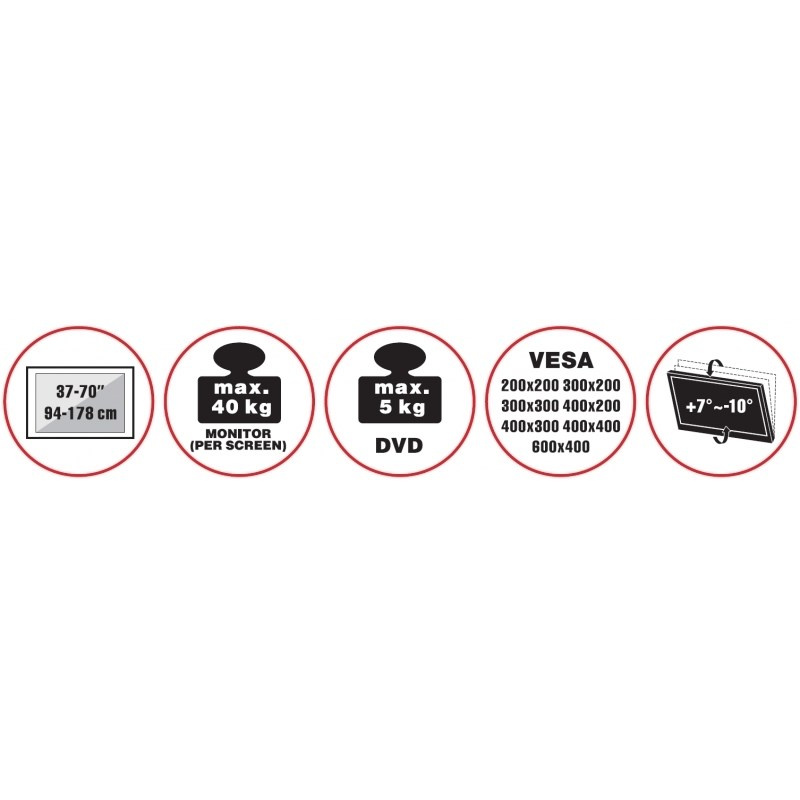 Dizajnový stolík na veľké LCD TV s uhlopriečkou 37"- 70" (94-178cm) a hmotnosťou maximálne 40kg. Stredový nosný profil 111,5-141,5cm na elegantnej základnej doske, držiak výklopný +7°/-10°, polička 30x35cm max. 5kg, oceľová konštrukcia až ku stene, rozmer 70x52x161,8cm, farba čierna. Uchytenie VESA: 200x200, 300x200, 300x300, 400x200, 400x300, 400x400, 600x400.