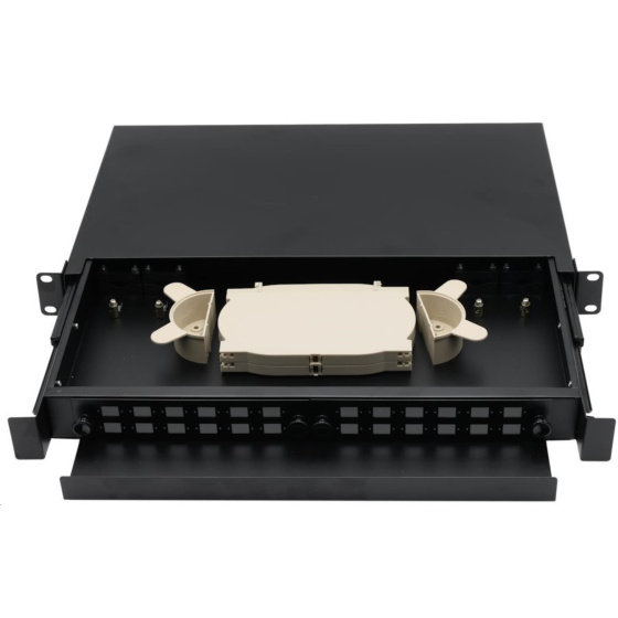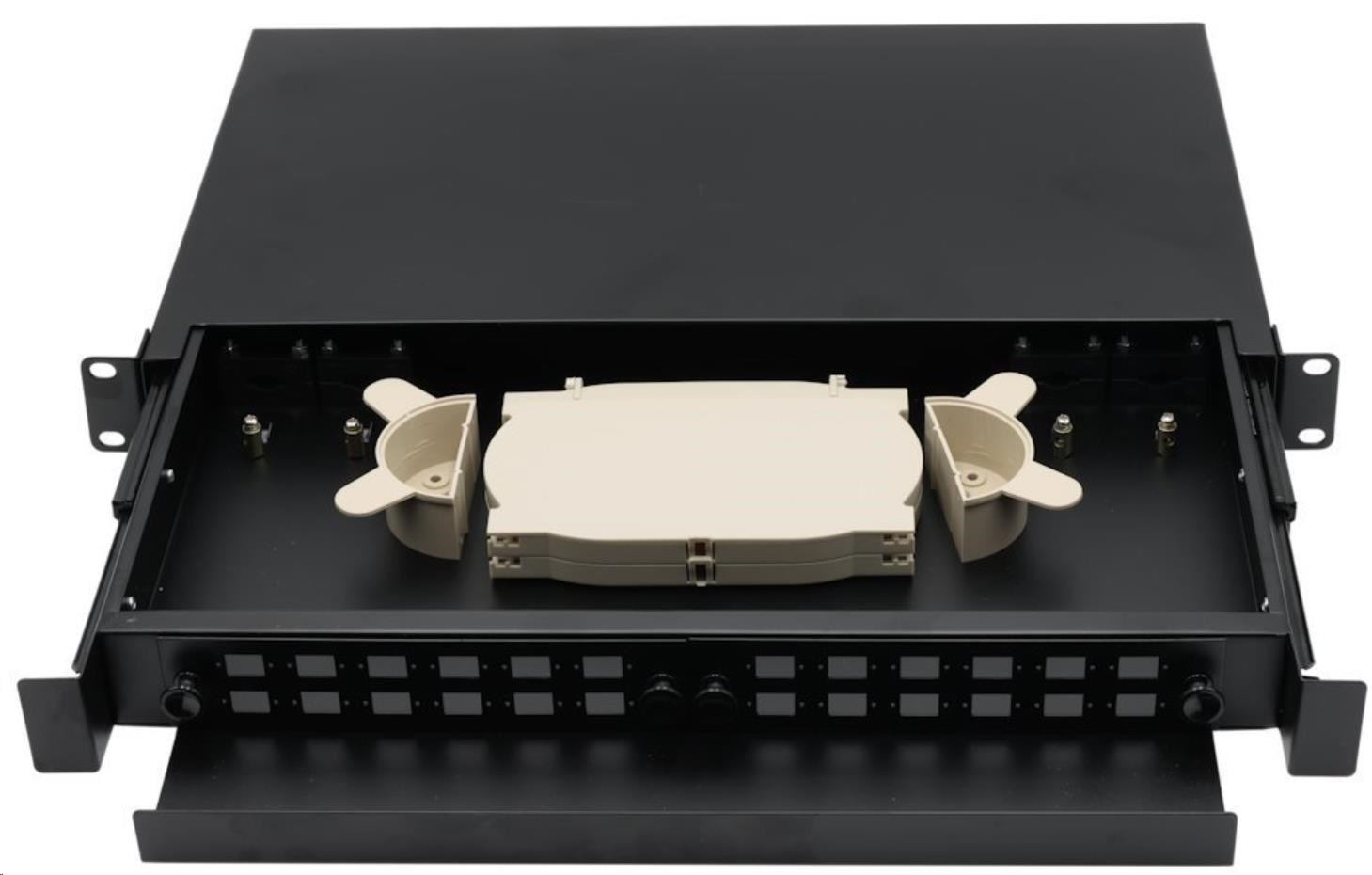 19" rozvádzač, výška 1U, pre 24 simplex adaptérů SC alebo duplexných LC, farba čierna, kovová skrinka, kazeta na zvarky. Van sa vysúva pomocou posuvných koľajníc.
