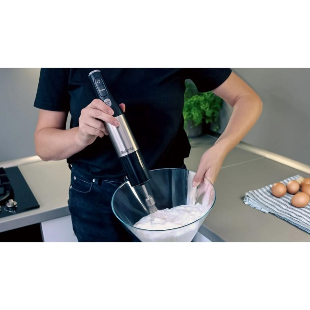 Salente Mixxo prichádza do vašej kuchyne aj s bohatým príslušenstvom: môžete využívať šľahaciu nadstavec s nerezovou metličkou, mixovaciu nádobu o objeme 600 ml (s odmerkami po 100 ml) a tiež sekáč s objemom 500 ml, ktorý je vybavený nerezovými sekacími nožmi a silikónovou protišmyšľovou podložkou. Zakúpením tohto všestranného mixéru jednoducho získate kompletné vybavenie, ktoré posunie vaše kulinárske čarovanie o úroveň vyššie.