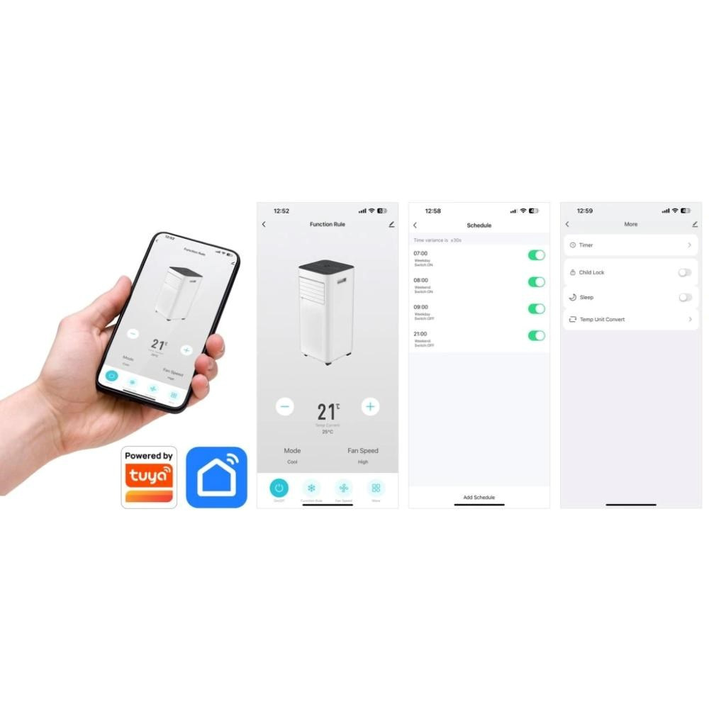 Klimatizaci je možné propojit s mobilním telefonem díky bezplatné aplikaci Tuya SmartLife, která je ke stažení jak pro mobilní telefony iPhone, tak pro všechny mobilní telefony se systémem Android. Vybrat si můžete ze dvou způsobů připojení – WiFi nebo Bluetooth. Mobilní aplikace nabízí tyto možnosti ovládání a přehledů: