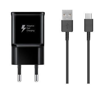 Samsung cestovní nabíječka do sítě s USB výstupem a maximálním výkonem 15W a USB-C nabíjecím kabelem.
