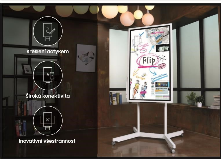 Elegantný svetlo šedý vzhľad Samsung Flip z neho robí dokonalý doplnok každého moderného pracoviska. Vyniká ergonomickým dizajnom s možnosťou naklonenia o 4,5 stupňa. Taktiež je vybavený puzdrom na pero a odkládateľnou poličkou. Flip je jednoducho pripravený poskytnúť vám moderný spôsob pôsobivej prezentácie myšlienok aj praktické pomôcky pre každodennú prácu.