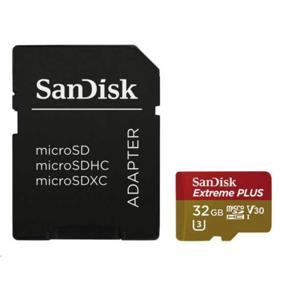 Karta SanDisk MicroSDHC 32GB Extreme PLUS (10MB/s, UHS-I V30, Rescue Pro Deluxe) + adaptér