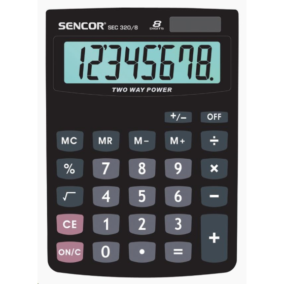 Stolová kalkulačka s veľkým displejom Veľký 8-miestny displej Výpočet percent, výpočet odmocniny Označenie 3-miestnej čiarky, 4-tlačidlová pamäť Plastové tlačidlá, nezávislá pamäť Napájanie: Duálny solárno-batériový Zdroj: 143 x 102 x 29 mm, hmotnosť: 100 g EAN 8590669065417