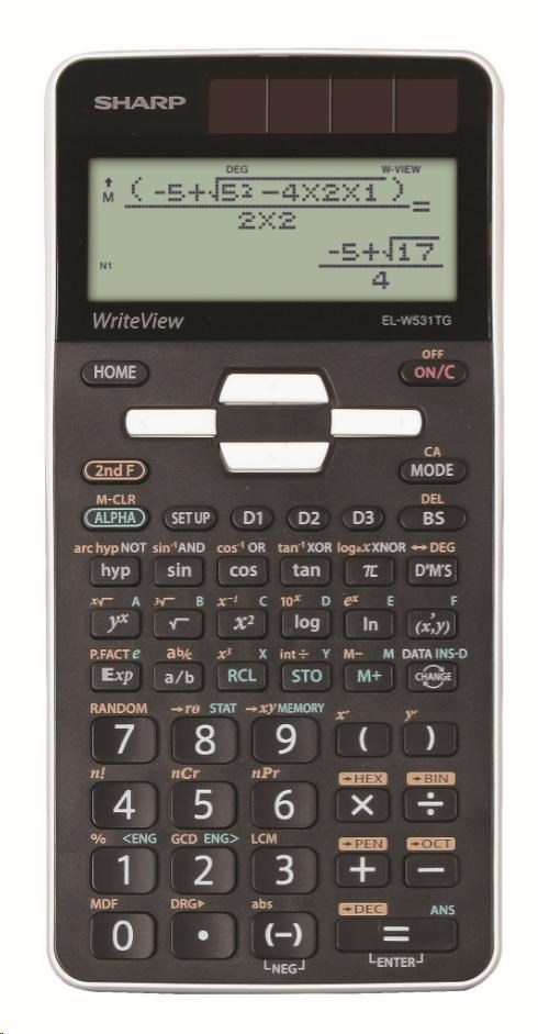 Vedecký kalkulačka EL-W531TG obsahuje 422 matematických funkcií a je vhodná najmä pre študentov stredných škôl. Bodový displej "WriteView" umožňuje zápis a zobrazenie výrazov v bežnom matematickom vyjadrení, teda rovnako ako na papieri. Solárne napájanie šetrí záložnú batériu a pevný plastový kryt chráni kalkulačku pred poškriabaním a pádmi.