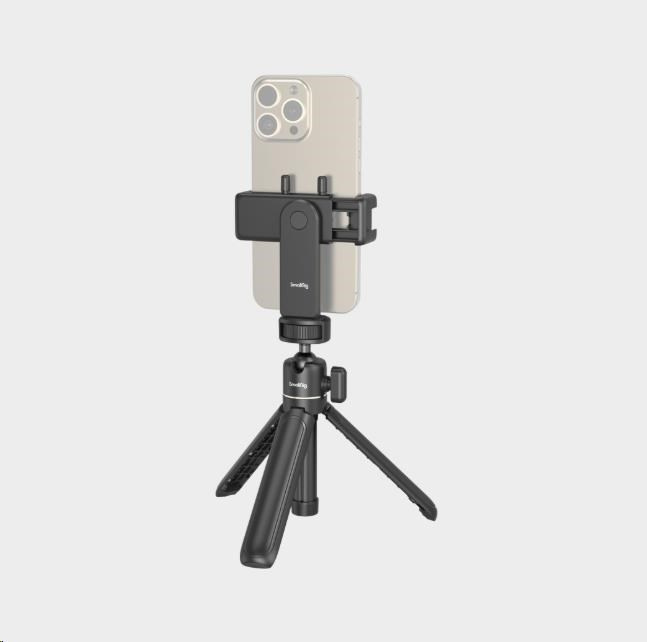 Jedním šroubem 1/4"-20 se stativ připevní k držáku chytrého telefonu, který má dva úchyty cold shoe pro mikrofon, LED video světlo atd.