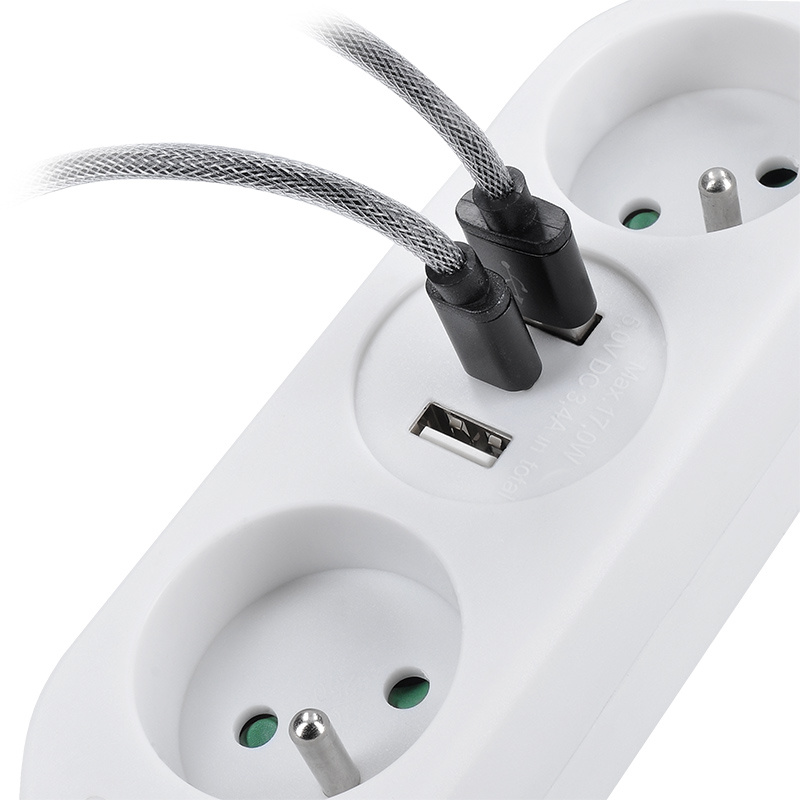 Prodlužovací napájací kábel so dvoma zásuvkami a USB nabíjačkou. Skladný, výkonný, ľahko prenosný. Ideálny na nabíjanie elektronických zariadení na cestách.