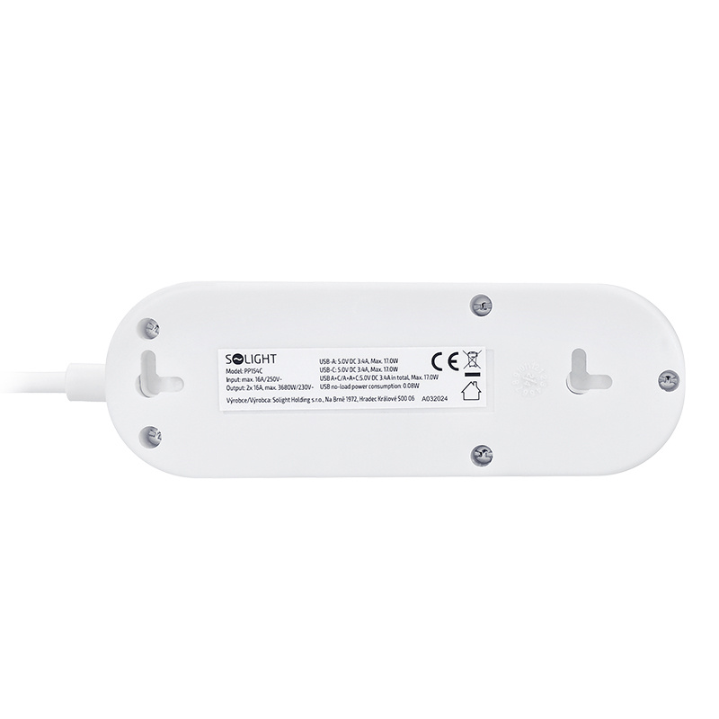 Popis Solight 2z + USB A+C 17W, cestovní prodlužovací přívod 1.5m, bílý