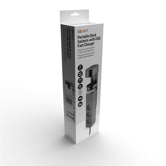 Popis Solight 3z + USB A+C přenosné stolní zásuvky, 2m, černá, USB rychlonabíječka 20W PD