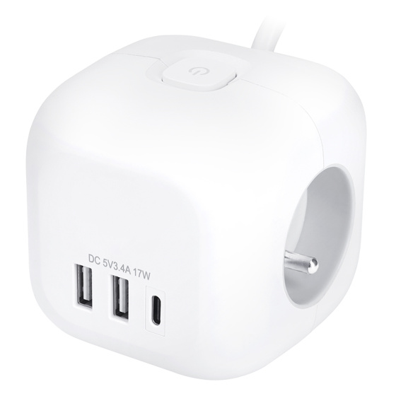 Predlžovací prívod v tvare kocky s dĺžkou strany 8 cm spája tri uzemnené zásuvky s detskou poistkou a USB nabíjačku s portami USB-C a USB-A. Vďaka 2m dlhému káblu poskytuje flexibilné využitie. Protisklzové podložky udržiavajú prívod stabilný na stole alebo pracovnej ploche. Podsvietený vypínač umožňuje jednoduché ovládanie všetkých zásuviek aj USB portov.