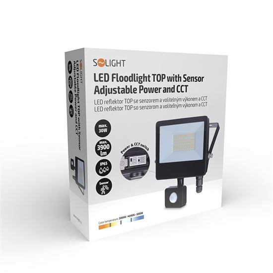 Popis Solight LED reflektor se senzorem TOP, 30W, max. 3900lm, 3CCT, volitený výkon 100/66%, IP65, rychlospojka