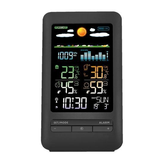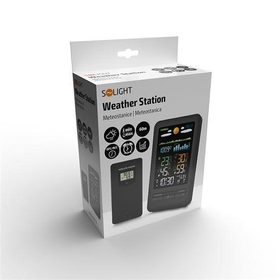 Popis Solight meteostanice, barevný LCD, vnitřní/venkovní teplota a vlhkost, tlak, RCC, černá