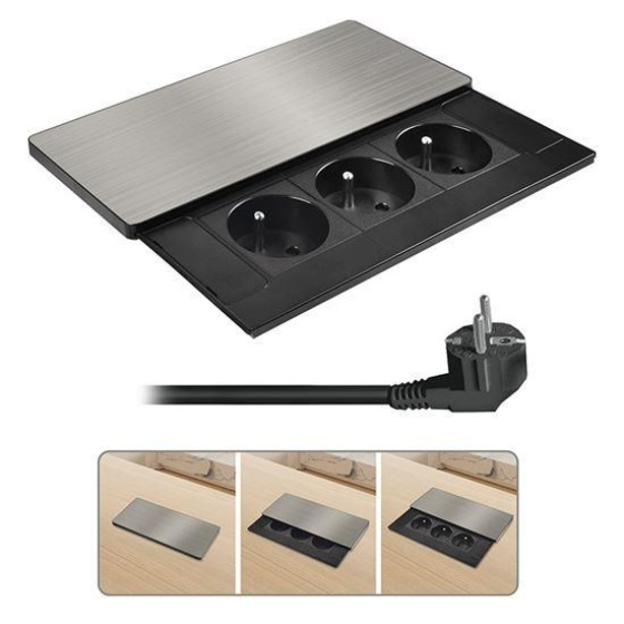 Horný kryt z matnej tmavej nerezovej ocele (inox) pôsobí elegantne a ľahko sa začlení do akéhokoľvek moderného interiéru. Nízky profil a posuvné otváranie šetrí miesto a nenarušuje vzhľad pracovnej plochy. Ovládanie je jednoduché, kryt stačí posunúť a zásuvky sú ihneď k dispozícii.