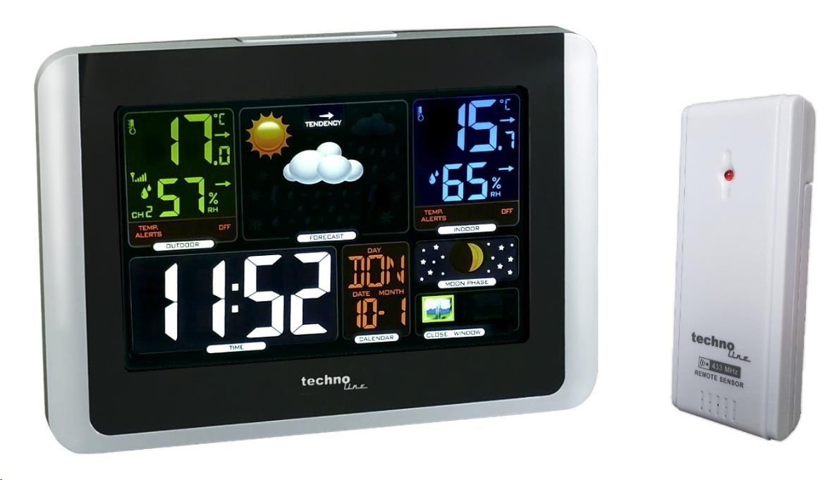 Meteorologická stanica s inverzným farebným LED displejom - farebný inverzný LED displej 127 x 79 mm, stále osvetlený pri napájaní sieťovým adaptérom, 2 stupne jasu, možnosť vypnutia, pri napájaní batériami možnosť osvetlenia displeja na 10 s - farby displeja: čas biela, dátum oranžová, vnútorná teplota a relatívna vlhkosť modrá, vonkajšia teplota a relatívna vlhkosť zelená - veľkosť číslic: čas 25,5 mm, skrátený názov dňa, dátum 10 mm, teplota 15,5 mm, rel. vlhkosť 11,5 mm - čas riadený rádiovým signálom DCF-77 - možnosť manuálneho nastavenia času - 12- alebo 24-hodinový formát zobrazenia času - možnosť nastavenia časovej zóny od -12 do +12 hodín - dátum, skratka názvu dňa (EN, FR, GE, SP, IT, NL, DK) - budík s funkciou opakovaného budenia (Snooze) po 10 minútach - budenie zvukovým signálom (10 sekúnd 1 pípnutie za sekundu, 10 sekúnd 2 pípnutia za sekundu, potom stále 4 pípnutia za sekundu) - 6 animovaných ikon predpovede počasia (jasno, polojasno, zamračené, dážď, búrky, snehové prehánky) - zobrazenie hodnôt vnútorné a vonkajšej teploty a relatívnej vlhkosti - možnosť zobrazenia teploty vo F alebo ve C - pamäť na max. a min. namerané hodnoty teploty a relatívnej vlhkosti (automaticky sa maže o 0:00) - šípky tendencie vývoja barometrického tlaku, vnútorné teploty a relatívnej vlhkosti - alarm horná a dolná hranica vonkajšej teploty na každom kanáli v rozsahu od -40 °C do +60 °C zvukovým signálom - alarm horná a dolná hranica vnútorné teploty v rozsahu od 0 °C do +50 °C zvukovým signálom - ikona nutnosti zatvorenia alebo otvorenia okna na základe nameraných vnútorných teplôt a relatívnej vlhkosti - možnosť zobrazenia vonkajšieho rosného bodu a teplotného indexu - fáza Mesiaca - možnosť pripojenia až 3 bezdrôtových senzorov mode- mode- TX960-TH, jeden bezdrôtový senzor je súčasťou balenia - možnosť automatického prepínania kanálov po 30 s - bezdrôtový prenos hodnôt vonkajšej teploty na frekvencii 433 MHz - dosah až 100 m v otvorenom priestore - indikácia slabých batérií - farba hlavnej jednotky čierna so strieborným rámikom - rozmery hlavnej časti 174 x 119 x 29 mm - napájanie sieťovým adaptérom alebo batériami - možnosť postavenia alebo zavesenia Bezdrôtové čidlo TX960-TH - vodeodolné prevedenie - dosah signálu bezdrôtového čidla až 100 m v otvorenom priestore - meranie teploty a relatívnej vlhkosti - indikácia vysielania LED diódou - možnosť postavenia a zavesenia - farba biela - rozmery 39 x 99 x 24 mm - napájanie 3 ks batérií 1,5 V typ AAA (mikrotužkové) Obsah balenia - hlavná jednotka WS 6442 - bezdrôtové čidlo TX960-TH - sieťový adaptér 5 V, 150 mA - návod CZ, EN, PL, GE, FR, ES, IT, NL