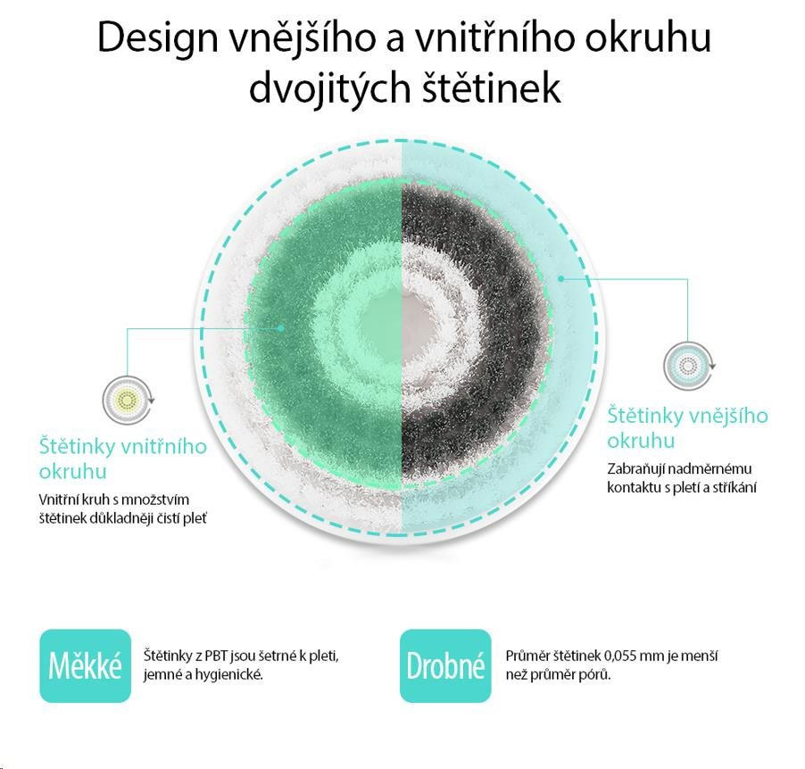 • 0,055 mm PBT kefka pre odstraňovanie mazu, nečistôt a make-upu