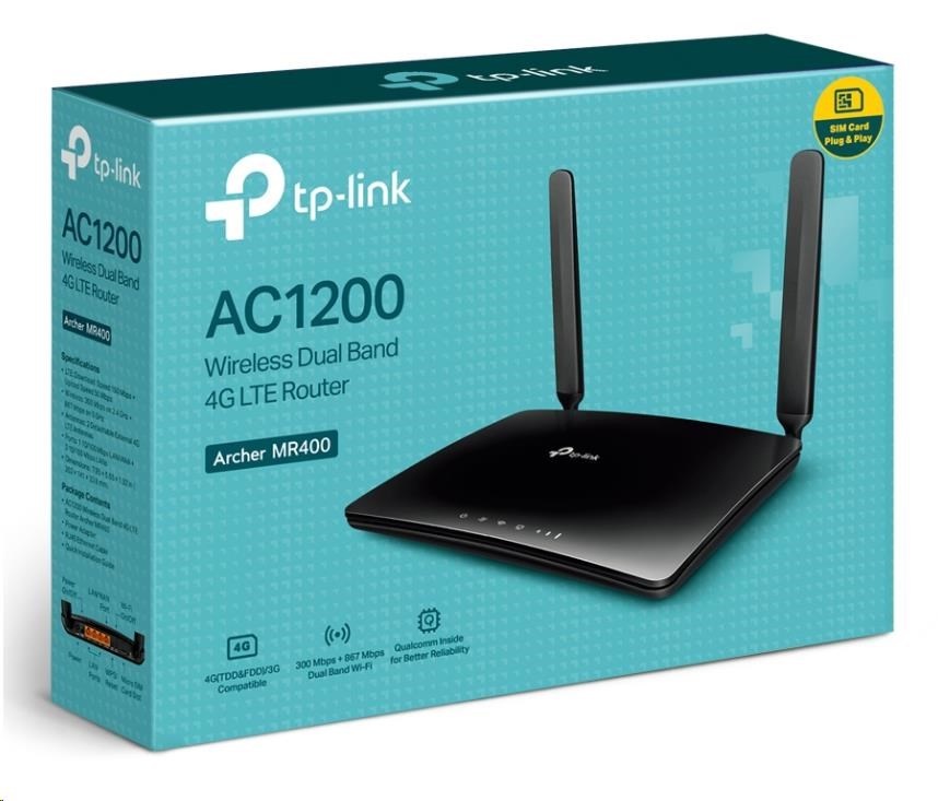 | Package Contents | AC1200 Wireless Dual Band 4G LTE Router, Archer MR400 RJ45 Ethernetový Kábel Napájací adaptér Rýchly inštalačný sprievodca |