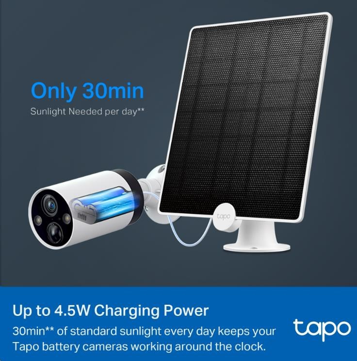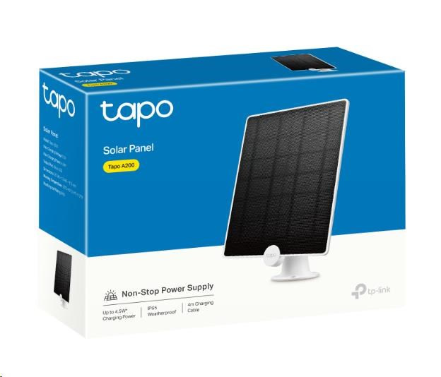 | Obsah balenia | Solárny panel Tapo A200 Nastaviteľný montážny držiak Nabíjací kábel 4 m/13 ft Montážne hmoždinky Skrutky na montáž Montážna šablóna Vodotesná gumená tesniaca vložka Rýchly návod na použitie |
