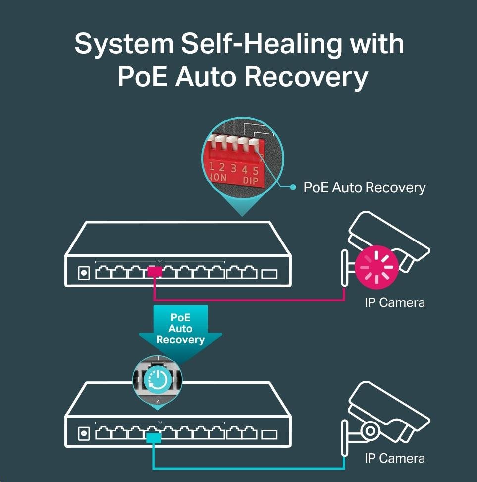 | Pokročilé funkcie | • Kompatibilné s IEEE 802.3af/at PD • Extend Mode Button (porty 1–4, až 250 m napájania PoE a prenosu dát) • Priorizácia režimu (porty 1–2) • Režim izolácie (porty 1–4 / 5–8) • Automatické obnovenie PoE (porty 1-8) • Autom. učenie a stávanie MAC adries • IEEE802.3x Flow Control pre Full-Duplex režim a Backpressure pre Half-Duplex režim |