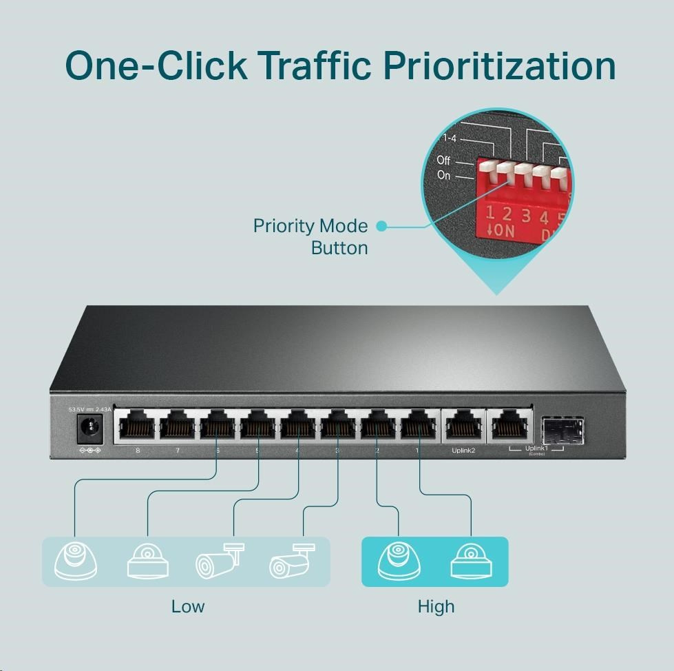| Rozhranie | • 9× 10/100/1000 Mbps RJ45 portov • 1× 1000 Mbps Combo SFP/RJ45 port • Automatická negociación • AUTO MDI/MDIX |