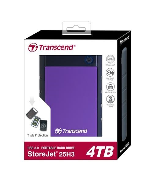 Popis Externý pevný disk TRANSCEND 2,5" USB 3.1 StoreJet 25H3P, 4 TB, fialový (odolný voči nárazom)
