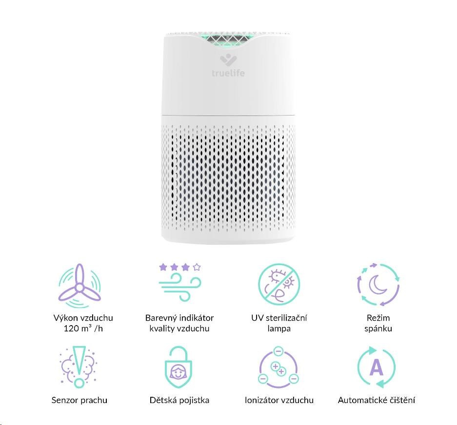 Čistička vzduchu TrueLife vyčistí až 120 m3 vzduchu za hodinu. Je vhodná do miestnosti o veľkosti 12-18 m2 a vďaka nízkej hmotnosti ju môžete bez obáv prenášať. Čistička celkovo zlepšuje kvalitu vzduchu, ničí vírusy, baktérie a iné nečistoty a môže tak významne pomôcť alergikom alebo astmatikom. Čistička je vybavená farebnými indikátormi kvality vzduchu, funkciou automatickej detekcie nečistôt a automatickým čistením. Ak bývate na mieste, kde sa často prachuje, poteší vás prítomnosť prachového senzora. 6-násobná filtračná sústava v podobe anti-bakteriálneho filtra, HEPA filtra, uhlíkového filtra, katalytického filtra, UV svetla a ionizácie zachytí až 99,9 % častíc prachu a vyčistí 93,5 % VOC látok. Zároveň zachytáva vírusy a koronavírusy.