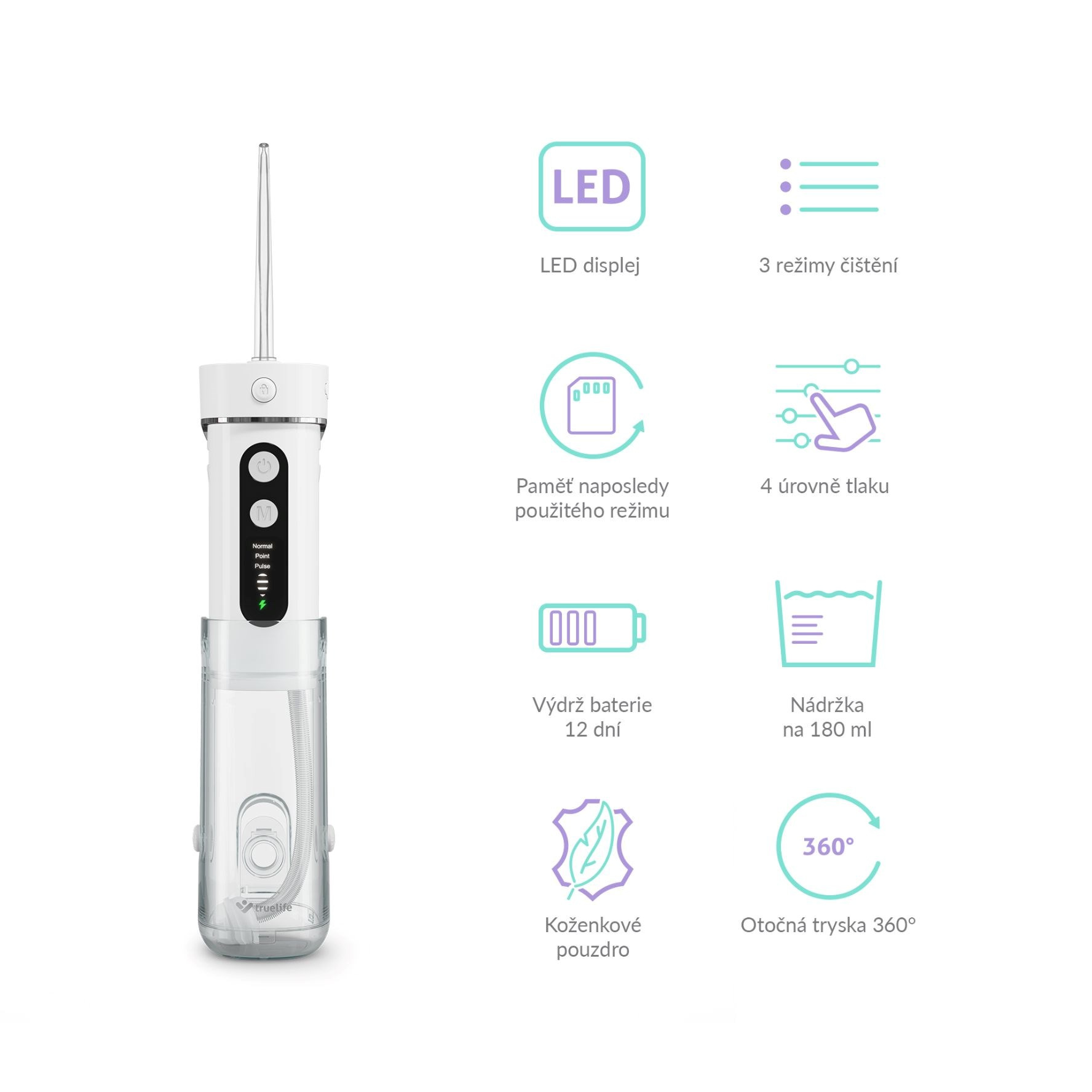 Doslova rajom pre baktérie sú v ústnej dutine medzizubné priestory. Chrániť zuby pred zubným kazom môžeme dôkladným čistením aj týchto ťažko dostupných miest. Ústna sprcha TrueLife AquaFloss Mini M50 je praktickým a komfortným pomocníkom. Poskytuje maximálne efektívne riešenie vďaka 3 režimom čistenia so 4 intenzitami tlaku pre každý z nich a technológiu StreamTrue®, ktorá odstráni až 99% povlaku a nečistôt. Technológia PulseTrue® príjemne masíruje ďasná a prispieva k ich regenerácii. Funkcia pamäť si zapamätá posledný použitý režim. Sprcha je novo vybavená aj jedinečnou tryskou Bubble Spraying technológiou, ktorá rozpráši vodu po celej ploche zuba. Nádržku s objemom 180 ml ľahko naplníte 3 rôznymi spôsobmi a hlavica otočná o 360° je zárukou, že sa dostanete do každého zákutia. Ústna sprcha je skvelá na doma, ale aj na cesty vďaka teleskopickému telu, koženkovému púzdru, možnosti uschovať trysku v hornej časti sprchy a výdrži batérie 12 dní.