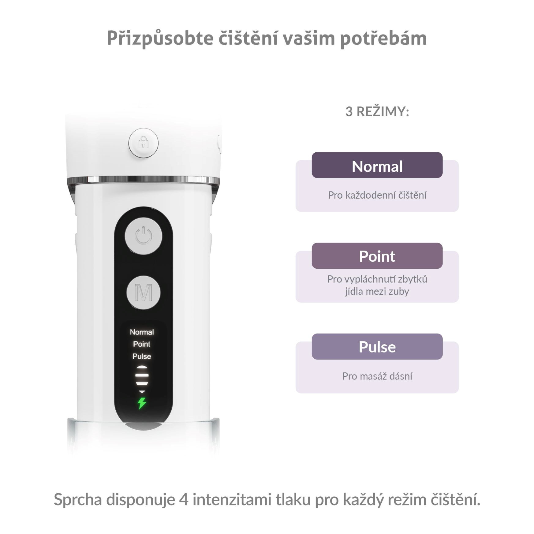 Sprcha poskytuje 3 režimy čistenia s rôznymi intenzitami tlaku (30 -130 PSI). Normal na bežné čistenie, Point na cielené a účinné odstránenie zvyškov jedla z medzizubných priestorov a Pulse na masáž ďasien.