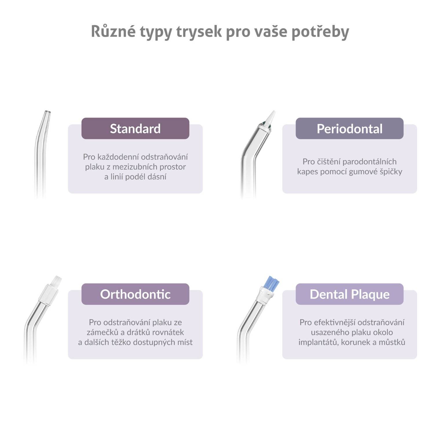 - Orthodontic – Ortodontická tryska pre odstraňovanie povlaku zo zámkov a drôtikov zubného strojčeka a ďalších ťažko dostupných miest