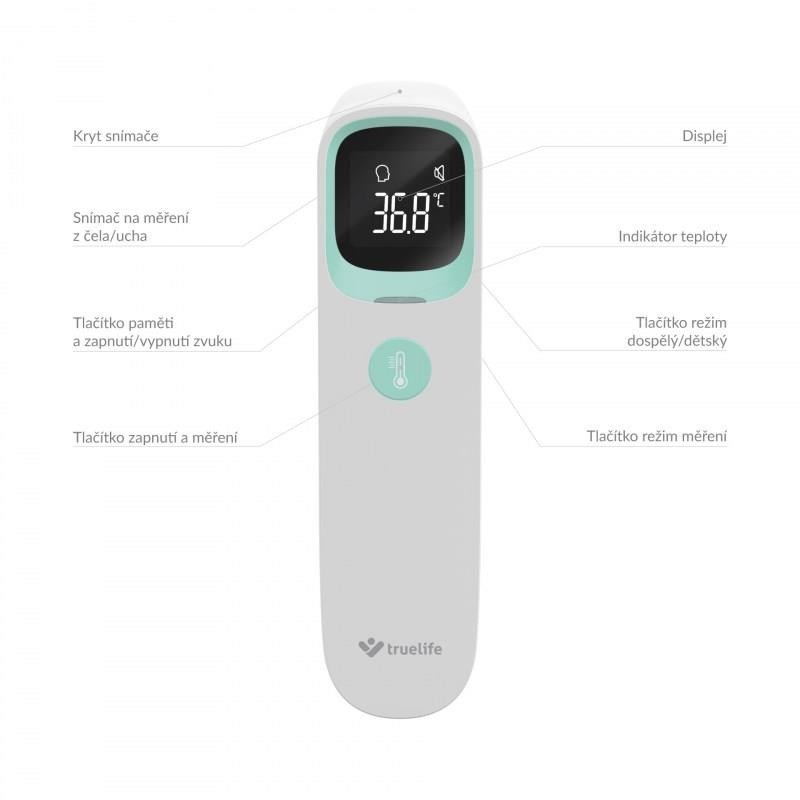 Zdlouhavému držaniu teplomera v podpazuší odzvonilo. Uľahčite si meranie teploty pri chrípke alebo nádche s bezkontaktným teplomerom TrueLife Care Q9. Teplotu dokáže zmerať za sekundu s presnosťou na 0,1°C. TrueLife Care Q9 ponúka tri režimy merania, vďaka ktorým môžete bezkontaktné zmerať presnú teplotu osôb z ucha alebo čela, aj predmetov alebo tekutín. Namerané hodnoty sa zobrazujú na LCD displeji a sú sprevádzané farebným indikátorom a zvukovým signálom. Teplomer vďaka jeho malým rozmerom je ideálny na cesty, dokáže si zapamätať 20 nameraných hodnôt a jeho batéria vydrží až na 20 000 meraní.
