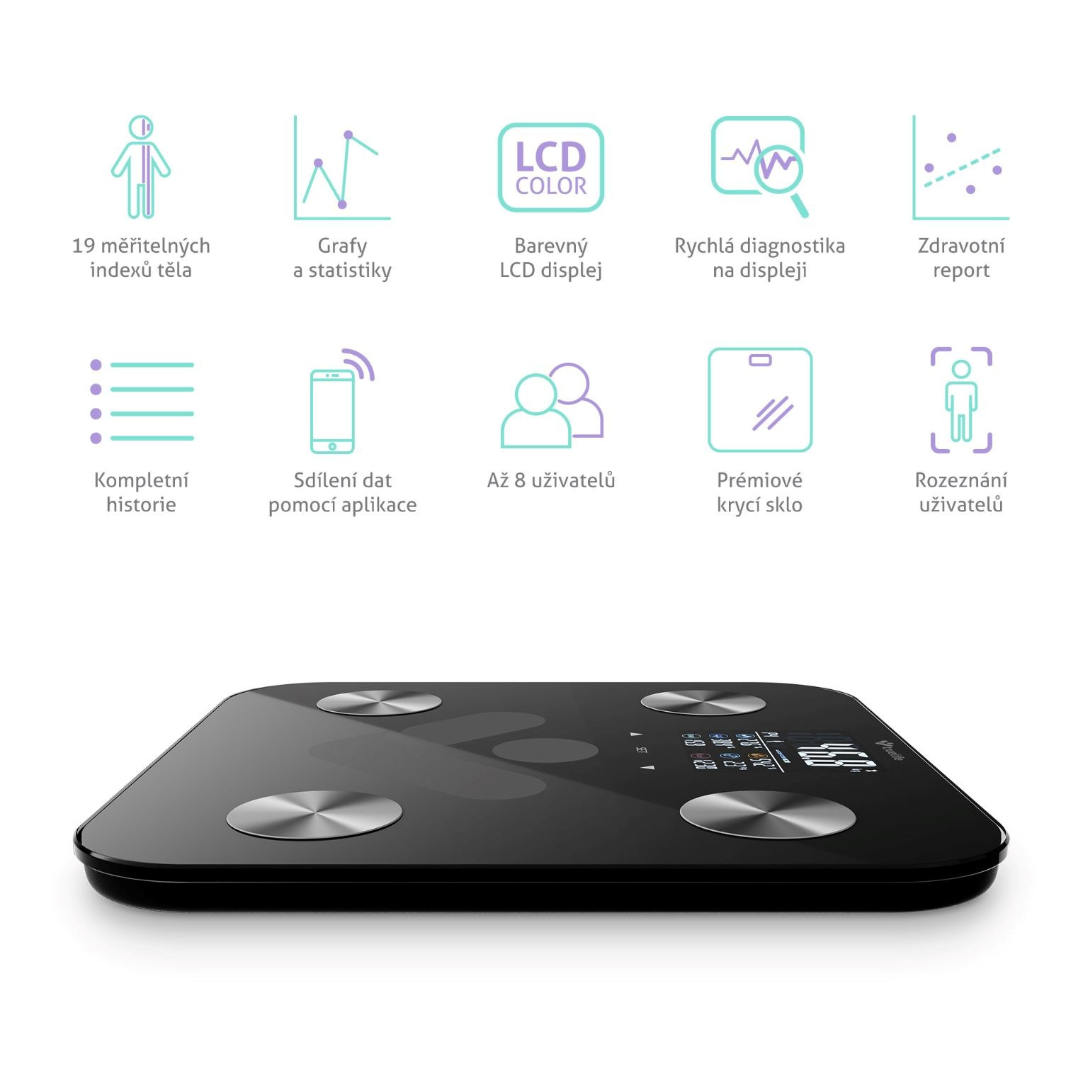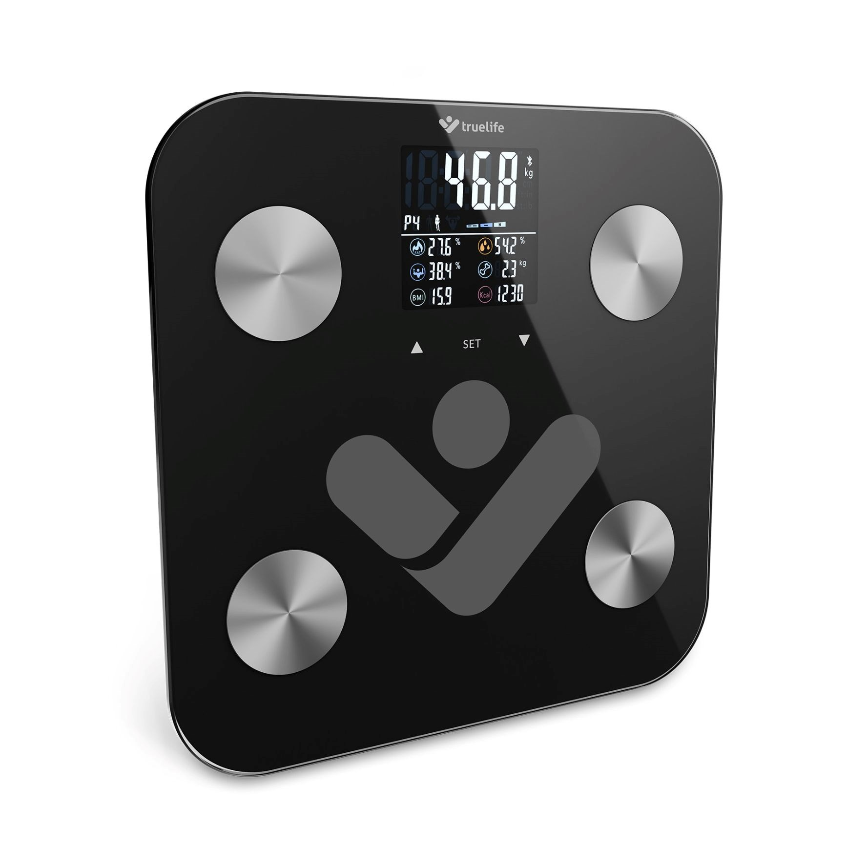 Domáca hmotnosť vám príliš veľa nepovie. Osobná váha TrueLife FitShape S6 BT Black dokáže viac a umožňuje spoznať telo do detailu. Okrem presného údaja o aktuálnej hmotnosti poskytuje vďaka bioelektrickej impedančnej analýze aj rad ďalších dôležitých informácií. Prehľadný farebný LCD displej so 7 indexami tela viditeľne zobrazí požadované hodnoty. Táto rýchla diagnostika toho o tele odhalí veľa, ešte podrobnejší popis všetkých, teda až 19 merateľných telesných indexov, získate prostredníctvom mobilnej aplikácie. Váhu iba cez Bluetooth prepojíte s telefónom a ihneď máte k dispozícii kompletné reportovanie o tele a štatistiky. Váha je dokonca tak inteligentná, že automaticky rozpozná používateľa. Jej prémiové krycie sklo odolá váhe až 180 kg.