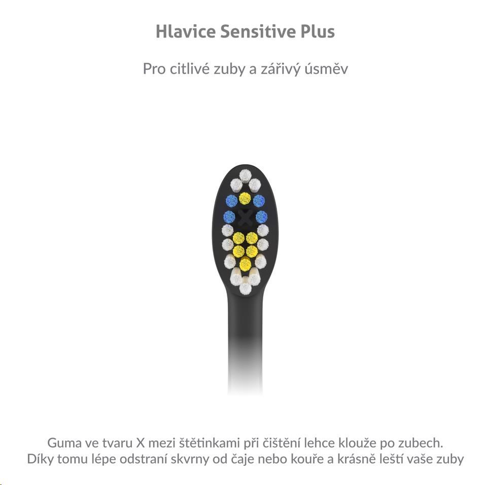 Náhradné hlavice sú špeciálne navrhnuté pre citlivé zuby. Guma vo tvaru X medzi štetinkami pri čistení sa mierne klzká po zuboch. Vďaka tomu lepšie odstráni škvrny od čaju alebo cigariet a krásne leští vaše zuby.