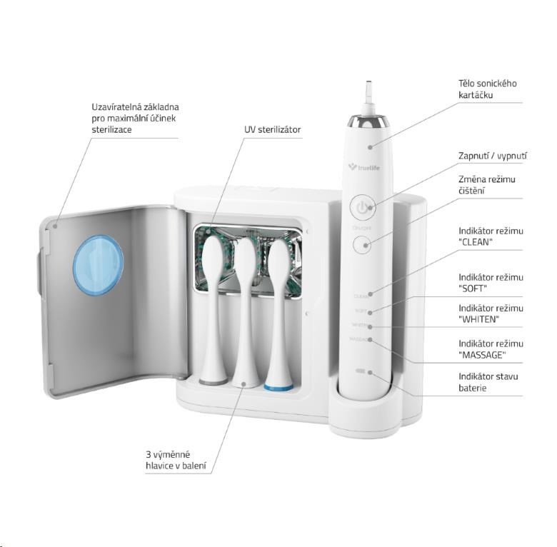 Sonický zubný kefka SonicBrush UV sa dokonale postará o vaše zuby. Pomocou vysokofrekvenčnej sonickej technológie odstráni maximum plaku zo skloviny aj ďasien a pritom je oveľa šetrnejšia než bežné rotačné kefky. K dispozícii sú hneď 4 režimy čistenia, ktoré ešte viac uľahčia starostlivosť o váš žiarivý úsmev. Vďaka dlhej výdrži batérie stačí kefku nabiť len raz za 10 dní a dodávaný UV sterilizátor zbaví jej hlavicu 99,9 % baktérií.