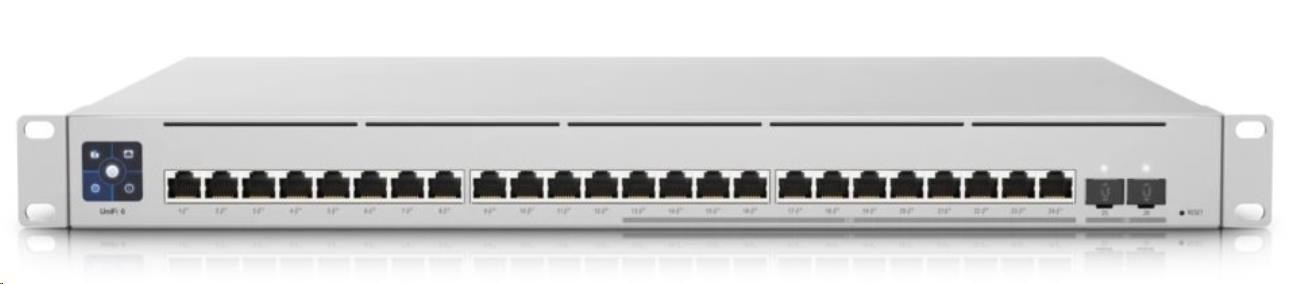 UniFi Switch Enterprise 24 PoE je spoľahlivý, spravovateľný 2.5-gigabitový prepínač L3 s prepínacou kapacitou 124 Gb/s, (12) 2.5-gigabitové porty LAN, ďalších (12) gigabitových portov LAN a dva porty SFP+ (10 Gb/s). Všetky ethernetové porty podporujú štandard 802.3af/at PoE-Out s výstupným výkonom 30 W/port a celkovým rozpočtom PoE 400 W. Okrem štandardných funkcií má prepínač aj 1,3" dotykový displej, ktorý poskytuje informácie o systéme, teplote, štatistikách portov, napájaní PoE a mnoho ďalších informácií. Prepínač je možné napájať štandardným 230V napájaním, ale aj prostredníctvom UniFi SmartPower RPS, ktoré slúži skôr na zálohovanie napájania v prípade výpadku interného zdroja.