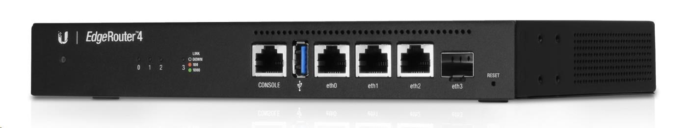 edgeRouter 4 je vhodný všade tam, kde je potrebné smerovať veľké množstvo dát, v malých a stredných podnikoch a všade tam, kde je prioritou bezpečnosť siete. EdgeRouter je vybavený celkovo 3x Gbit Ethernet porty, 1x SFP, dostatočne veľkou 1GB DDR3 pamäťou, 4GB úložným priestorom a 1x USB 3.0. Celú prevádzku riadi štvorjadrový procesor MIPS64 s taktom až 1 GHz a hardvérovou akceleráciou na spracovanie paketov. EdgeRouter ponúka všetky základné funkcie, ktoré od smerovača očakávate.