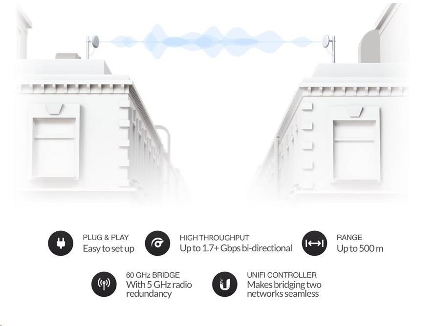 UniFi Building Bridge je 60GHz prepojenie bod-bod so záložným 5GHz pripojením na rozšírenie siete do susednej budovy. Priepustnosť spojenia je 1.7 Gb/s+ s maximálnym dosahom 500 m a správou alebo monitorovaním cez UniFi Controller.