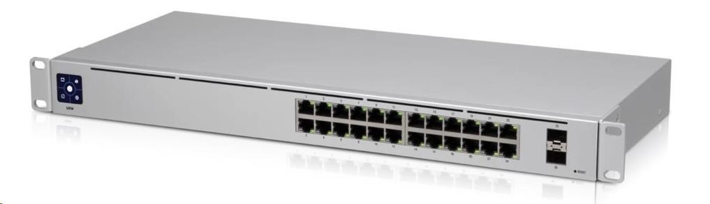 USW-24 je 19" rackový gigabitový prepínač L2 vybavený 24x gigabitovými portami LAN a dvoma portami SFP s prenosovou rýchlosťou 1 Gb/s. Okrem štandardných funkcií má prepínač aj 1,3" dotykový displej, ktorý poskytuje informácie o systéme, teplote, štatistikách portov a mnoho ďalšieho. Vďaka svojej konštrukcii a vynikajúcemu odvodu tepla nemá prepínač žiadny ventilátor, takže nevydáva zbytočný hluk, čo je ideálne napríklad na inštaláciu v kancelárii.